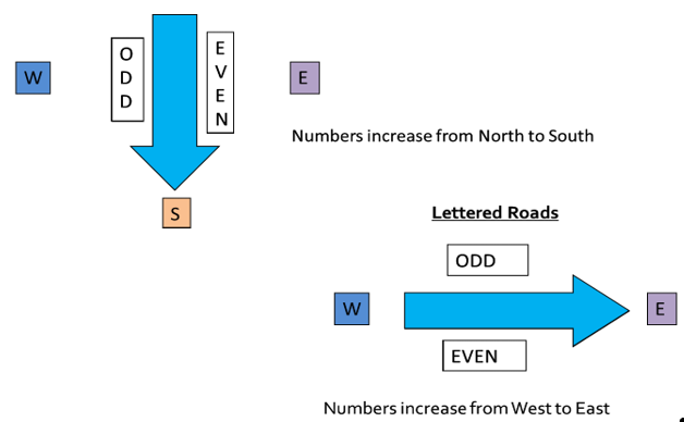 - Odd numbers are located on the west and north sides and even are located on the east and south sides of the road.